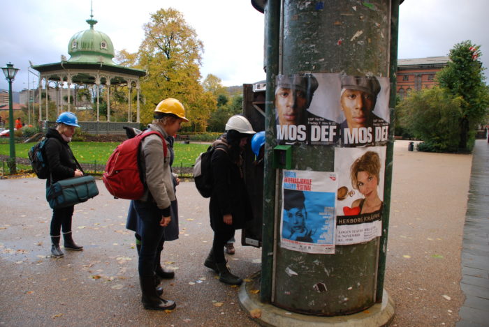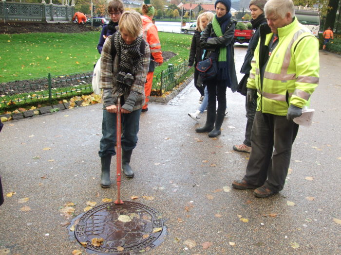 In the first week, workshop participants were guided through a series of discussions and tours conducted throughout the city of Bergen where they were introduced to different taxonomies of space, defensible space, the underground, hidden and unseen, weather space, remote space and sound and smell. One of the excursions involved a visit into several of the city’s underground sewer system. In the final week students were asked produce a final project for group presentation using as their starting points some of the experiences and information generated in the first week. Students were encouraged to think in terms of sketches and conceptual brainstorming to influence the generation of ideas not constrained by the limits of time and budget. Different artistic practices, such as the performance instructions of Yoko Ono, where the sketch, instruction or recipe is the artwork in itself, were used as reference.