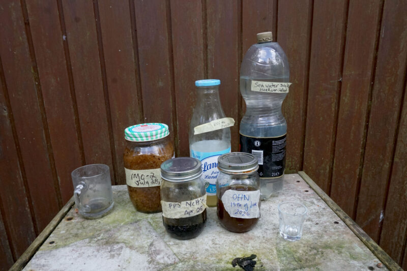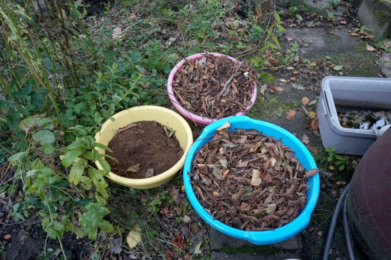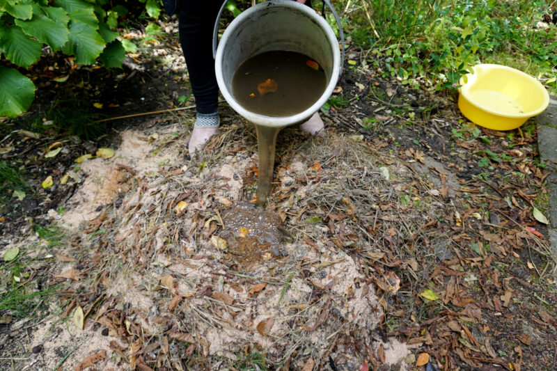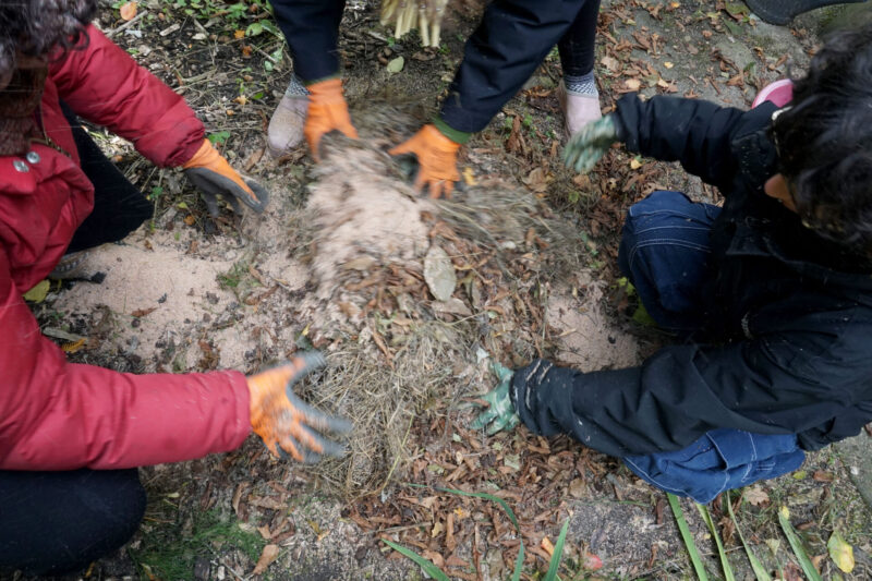 Together make a soil amendment using locally sourced ingredients, coffee grounds, bran, dried leaves, rain water, sea water, decaying compost, fermented nettle, fermented garlic, lacto-acid bacillus cultivated from rice and milk, indigenous microorganisms harvested from the soil next to the plum tree, that will help feed the soil for future harvests