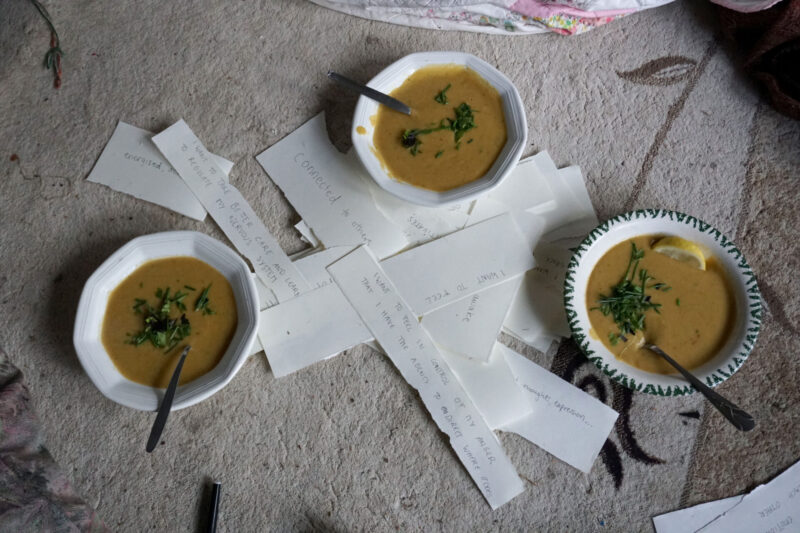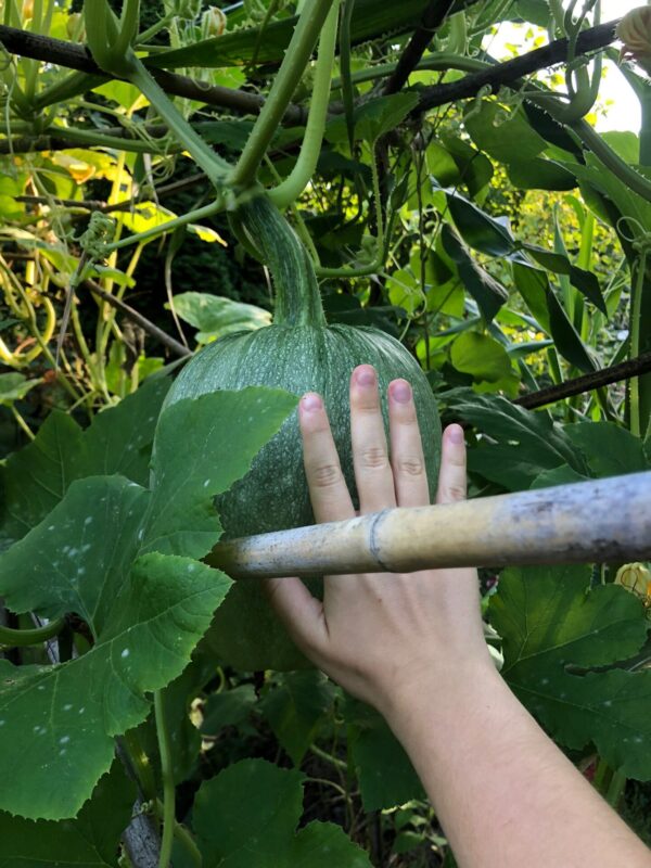 Ingredients: Freshly harvested Raramuri pumpkin grown from a gifted seed, bran, dried leaves, used coffee grounds, fermented nettle juice, fermented garlic, sea water, rain water, brown rice vinegar, worm castings, decaying compost, indigenous microorganisms cultivated from soil next to the plum tree, dried hay, rice, milk, raw sugar, wind storm, rain shower, sunshine, a story about land destruction and ecocide in Gaza, a prayer to the harvest that cannot happen in Gaza this year, a story about co-regulation and building collective solidarity, plastic tarp, bucket, rope, paper, drawing and writing materials.