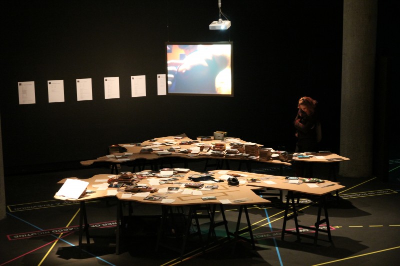 Materials: computer, monitor, press clippings, photographs, dvd player.
