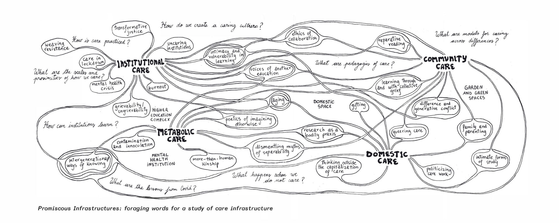 The Promiscuous Care Study Group emerged from the need to build up learning communities where we might recognize the abundance of working together in difference. Community care involves building relationships based on trust, understanding, and shared commitments while holding contradictory thoughts and feelings simultaneously. Or to quote bell hooks, it entails a form of acting that is “not assigned to the immediate social mythology of the status quo.”